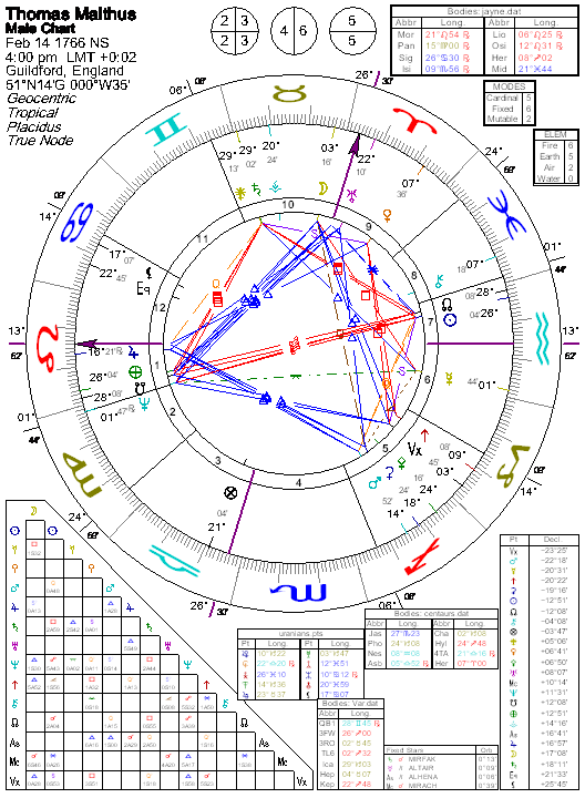 His theory of scarcity fits well with his Saturn in desirous Taurus square the Sun in Aquarius (the sign of distribution). Saturn is a planet of the third ray, and clearly his fields of history and economics pertain to the third ray. Interestingly, Jupiter is the planet of abundance and is rising in Leo (hardly a sign in which scarcity is considered). The chart, however, remains speculative. Whatever the Ascendant or which of the two given dates of birth is correct, the square from Saturn in Taurus to the Sun remains and is significant of Malthus’ economic philosophy.