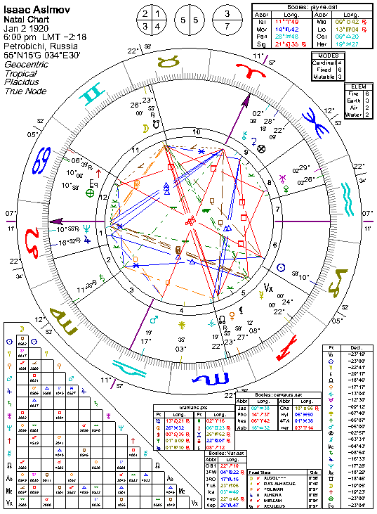 Isaac Asimov was a polymath—a versatile and multi-talented intellectual genius, whose sites were set (Mercury in Sagittarius) so it would seem, upon achieving the summit of materialistic knowledge. He began his career in the hard sciences, in keeping with the fifth ray components of his nature. His scope, however, was potentially too great to be confined by any one area of knowledge (note the “splash” pattern made by his planets once the asteroids and other points are removed for the sake of clarity). His intellectual attainments increased until they became staggering; he wrote about five hundred volumes on a great variety of subjects—science, science fiction, literary criticism. He had the speculative, far-ranging mind so often found with Mercury in Sagittarius. Gemini on the Ascendant would fit a great and prolific writer. Leo Ascending would fit with his appearance and his role of illuminator and teacher—also the sense of intellectual pride (perhaps justified) radiated by the Mensa society (reflective of the intellectual pride often associated with the third ray).. Cancer Ascending would fit his desire to incorporate the entire field of knowledge within his purview.