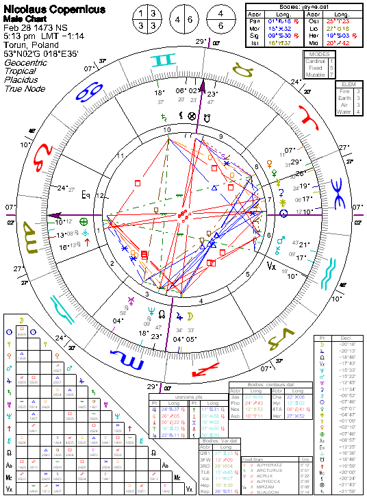 February 19, 1473, Torun, Poland, 4:48 PM, LMT. (Source: LMR cites Constellations 1977 which quotes J. Scperkowicz, “Nicolaus Copernicus,” “data from astrologers present at his birth” (February 19 OS, 5:00 PM LAT). Copernicus and His World, by Hugo Steiner) Died, of apoplexy on May 24, 1543, Frauenburg, East Prussia.