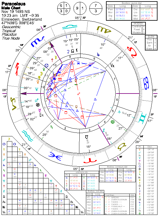 | Paracelsus—Alchemist, Physician, Magician Different horoscopes are given for Paracelsus, one with the Sun in Scorpio and another in Capricorn. Proposed time of birth: “Manly Hall in Astrological Review 3/1935. Kraum gave the same data in NAJ 4/2935 (