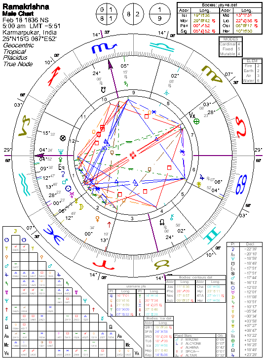 LMR quotes "Sri Ramakrishna, The Great Master," Vol 2, India, distributed by Vedanta, the original in Bengali by Swami Saradananda, translation by Swami Jagadananda.  Biography: Christopher Isherwood "Ramakrishna and his Disciples" (Vedanta Press, Hollywood, 1965, p.3) "Kamarpukau is not large enough to be on a map, it is 30 miles due south of Burdwan, which is northwest of Calcutta."  Isherwood gives "about dawn", rectified by Rudhyar to 5:25 AM LMT, however he gave the year of 1830.  Practical Astrology 3/1927 gave February 20, 1933, 7:30 AM.  "The Life of Ramakrishna" (1971) gives 1830, 5:15 AM.