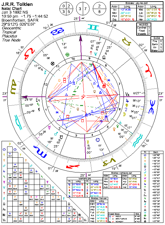 January 3, 1892, Bloemfontein, South Africa, 9:00 PM (Source: Tolkien, by H. Carpenter, stating that he was born between 8:00 PM, when the doctor arrived, and midnight. The time given is derived by Marc Penfield, based upon a letter from Tolkien’s father. Ruth Dewey, rectifies to 10:50 PM) Died, September 2, 1973, Bournemouth, England.