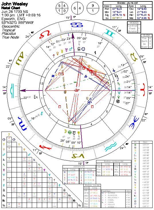 June 28, 1703, Epworth, England, 1:00 PM, LMT. (Source: speculative, per Marc Penfield) Died, March 2, 1791, London, England.
